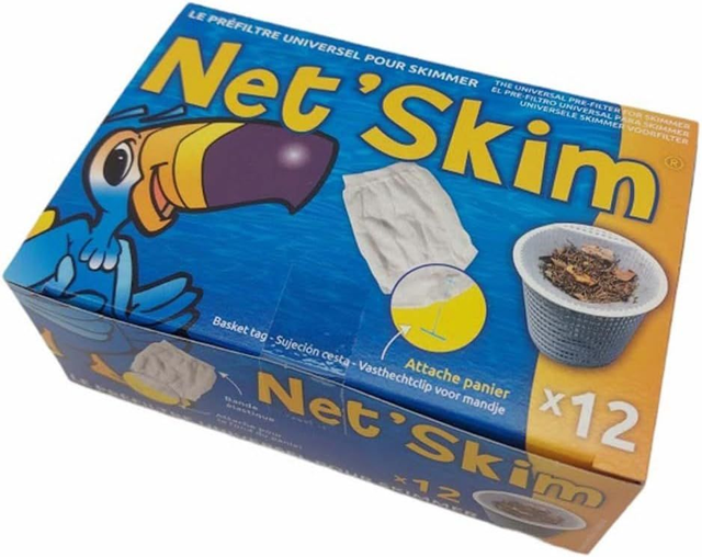 NET'SKIM est un sac préfiltre jetable hygiénique pour les paniers de skimmers. NET'SKIM permet l'amélioration de la qualité de l'eau, la préservation de la pompe et de l'ensemble du matériel piscine. Évacuation aisée des déchets. S'installe en 10 secondes dans tous les paniers avec ou sans poignée. Piscine, spas, filtration, NET'SKIM s'adapte à toute installation. Vendu par boite de 12 sacs. NET'SKIM est un sac préfiltre jetable hygiénique pour les paniers de skimmers. S'installe en 10 secondes dans tous les paniers avec ou sans poignée. boite plier pour envoie en enveloppe. Finesse de filtration : 250 - 300 microns. Convient pour les paniers de skimmer jusqu'à 24 cm de diamètre.